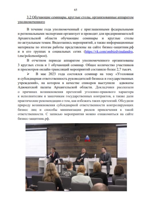 Ежегодно уполномоченный по защите прав предпринимателей Архангельской области готовит доклад для Областного собрания депутатов Архангельской области где отчитывается о проделанной работе.